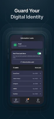 - Scans for compromised data associated with the email address used to login in the app